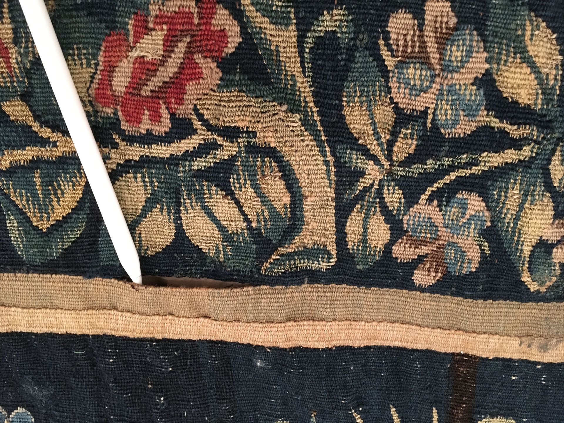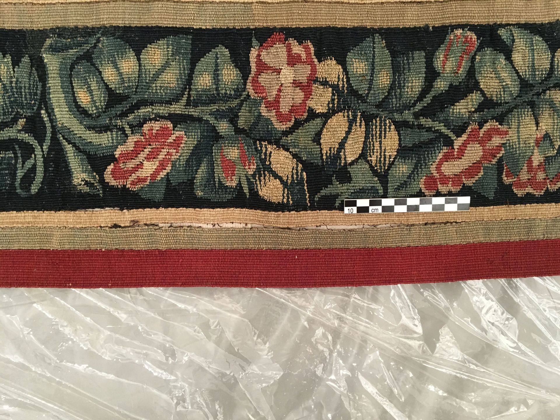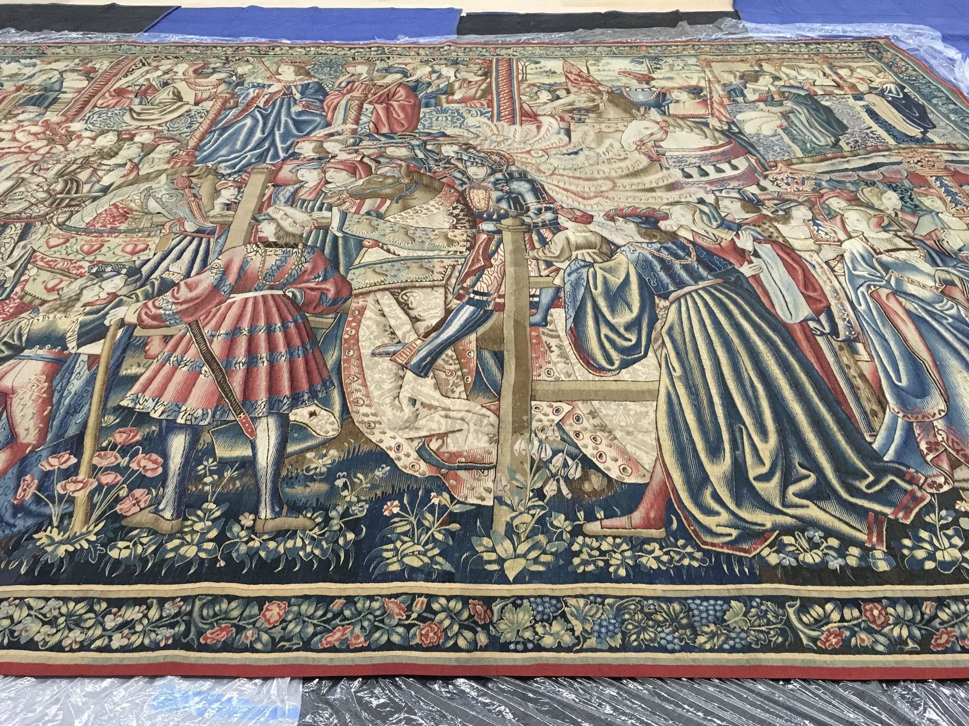 The studio is fully equipped to address the restoration and conservation of all types of textile, from minor repairs to complex re-creations. The photographs show the conservation of “The Salute before the Tournament’ from a set “Tournament of Vice and Virtue” 16th Century, Flemish School. Silk and Wool.