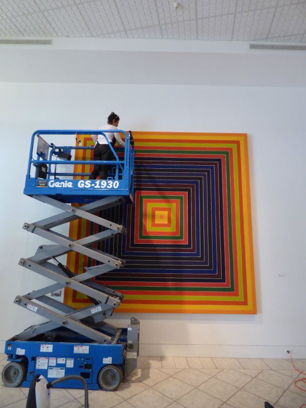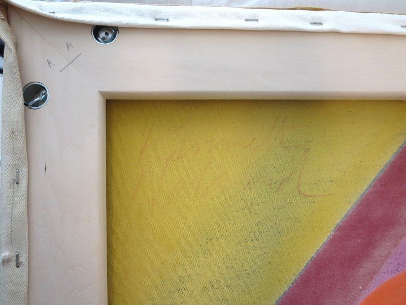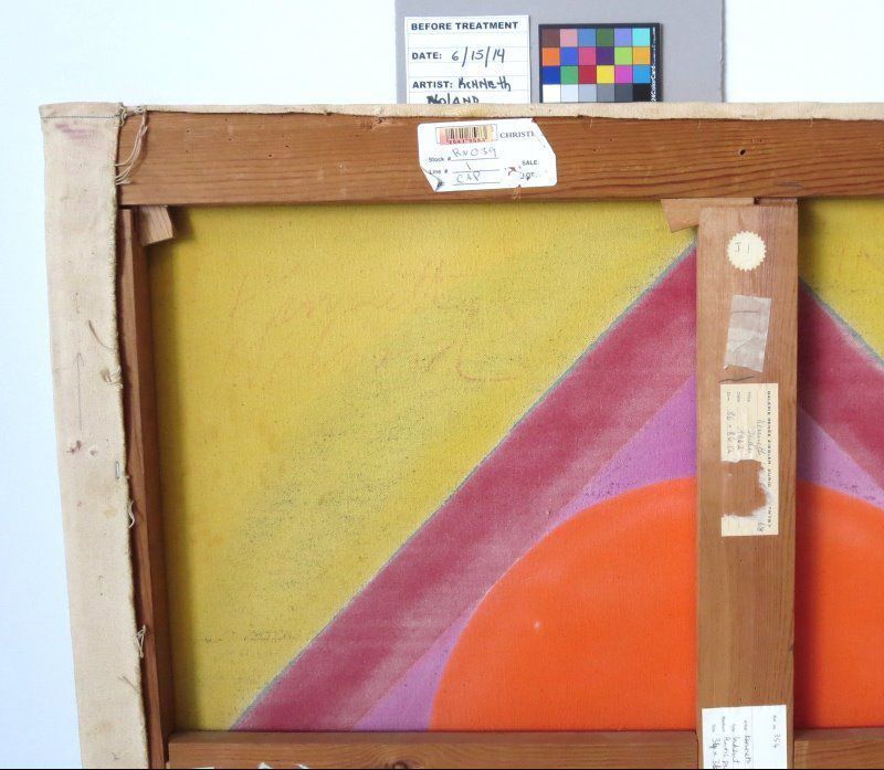 Photos below show the old stretcher on Kenneth Noland painting and a new mechanical stretcher.