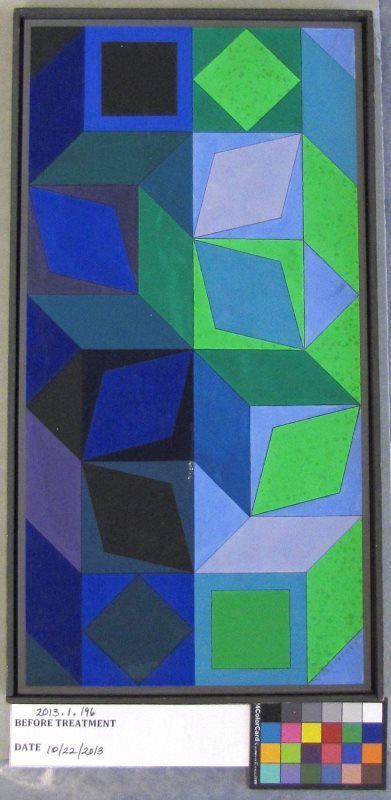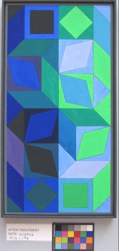 The oil on wood panel, 1947, is by artist Serge Ivan Chermayeff. The flaking paint on the panel was the result of transporting the artwork from a humid environment to a much drier climate. The consolidation (stabilization) of the paint layer was a very slow and meticulous process that involved the use of low viscosity consolidants while working in humidity controlled environment.