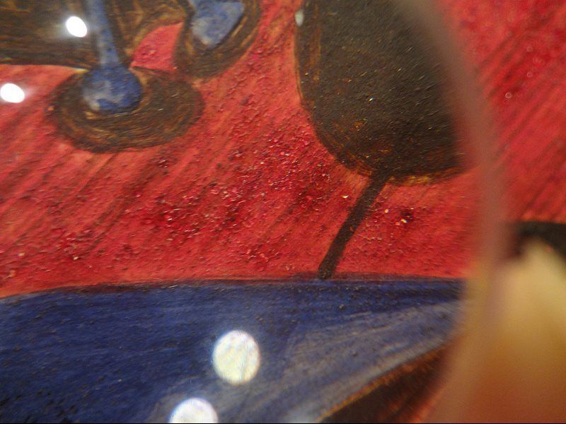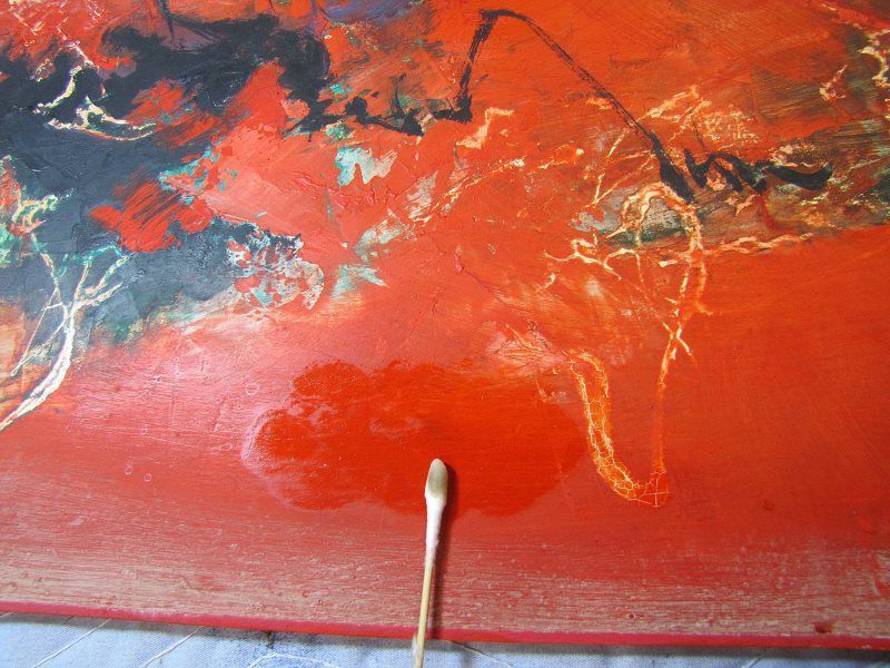 In the case of this painting (Untitled),the surface was exhibiting a blanched (whitish) area about 2 to 3 inches wide covering the entire perimeter of the painting including the signature. This discoloration was not part of the aesthetic of the piece and was disfiguring the image and original colors.