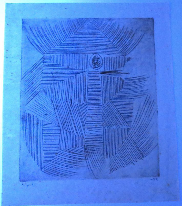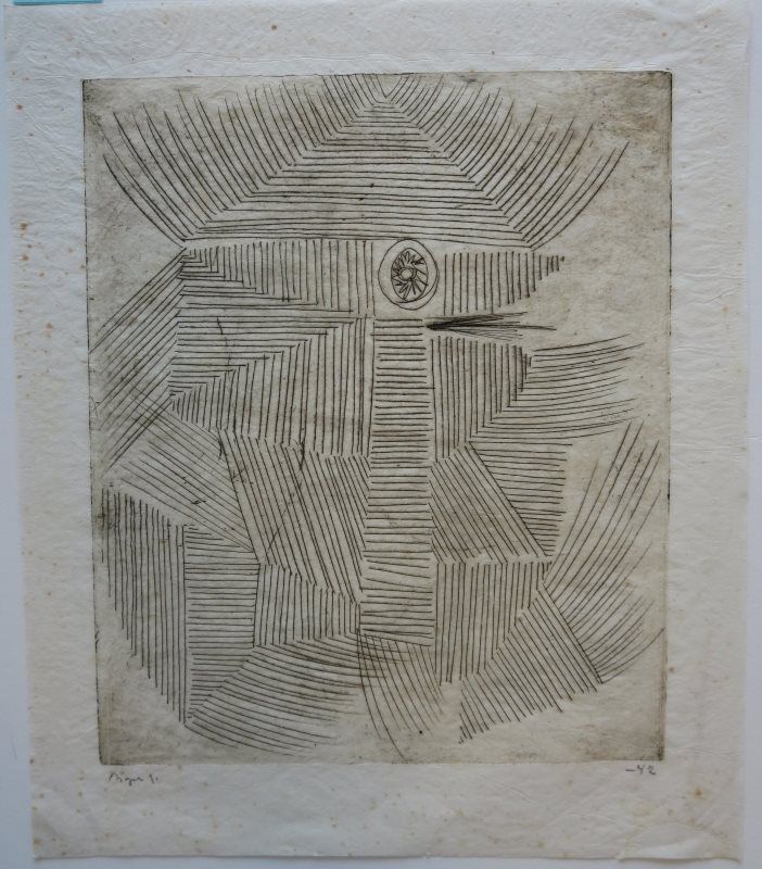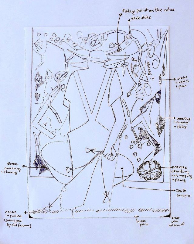 Man with Flowers, 1950, tempera on fiberboard, shows his typical vivid color and abstract treatment to realistic subjects. The above photographs the overall image, a detail of the cupping and flaking paint and a drawing done by the conservators to map the damaged areas prior to restoring them.