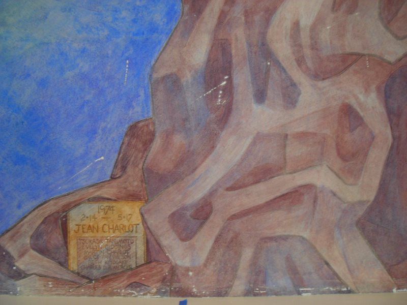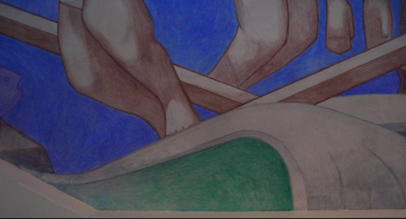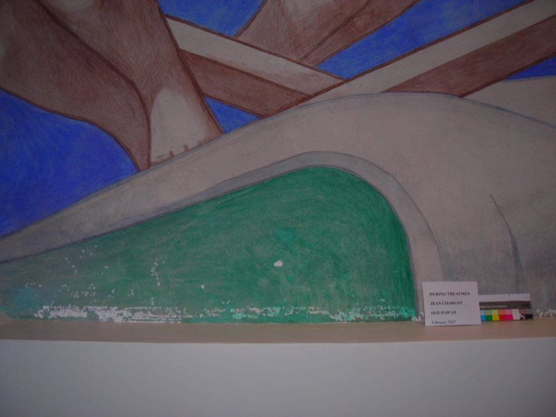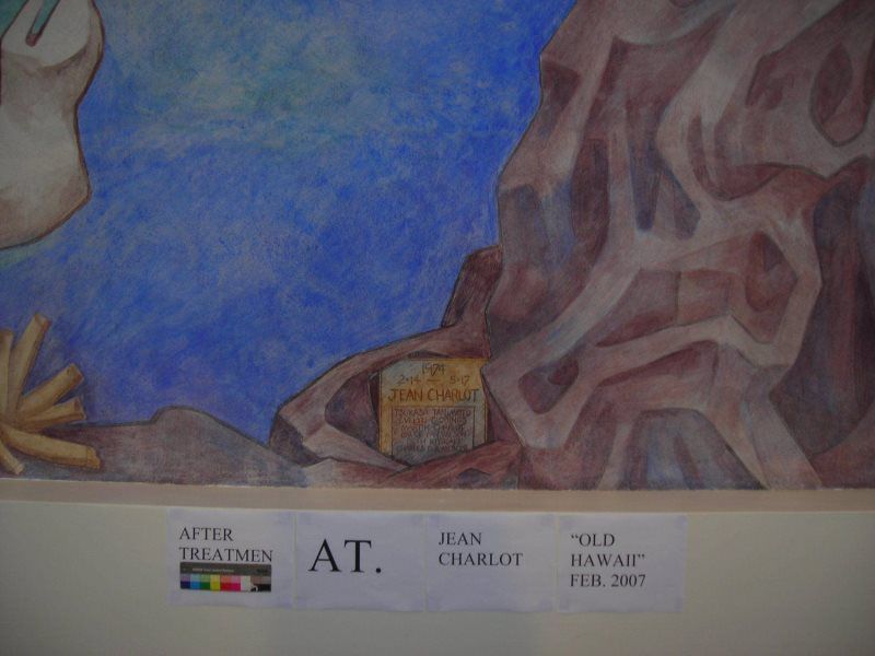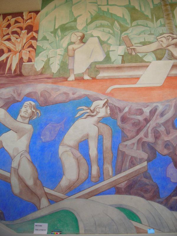 The Relationship Between Man and Nature in Old Hawaii by Jean Charlot is a unique mural located at the Leeward Community College Theatre lobby in Pearl City, Hawaii. The mural is approximately 100 feet by 25 feet in size and it was commissioned by the Hawaii State Foundation on Culture and the Arts for the LCC Theatre's grand opening in 1974. The French born artist was, as a young artist, part of the Mexican Mural movement in the 50’s working with masters such as Diego Rivera and David A. Siqueiros. The mural was conserved by Viviana Dominguez in 2007. The photos below shows before, during and after treatment.