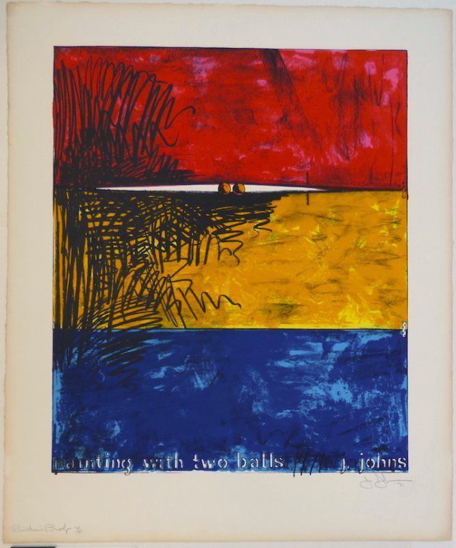 Jasper Johns "Painting of Two Balls" is a silkscreen from 1971. The edges of the paper were discolored (yellow-brown) due to acid burn from an old matt-board. The discoloration was topically treated repeatedly with a scientific grade alkaline solutions that were then neutralized. Planar distortions were flattened and small tears mended.
