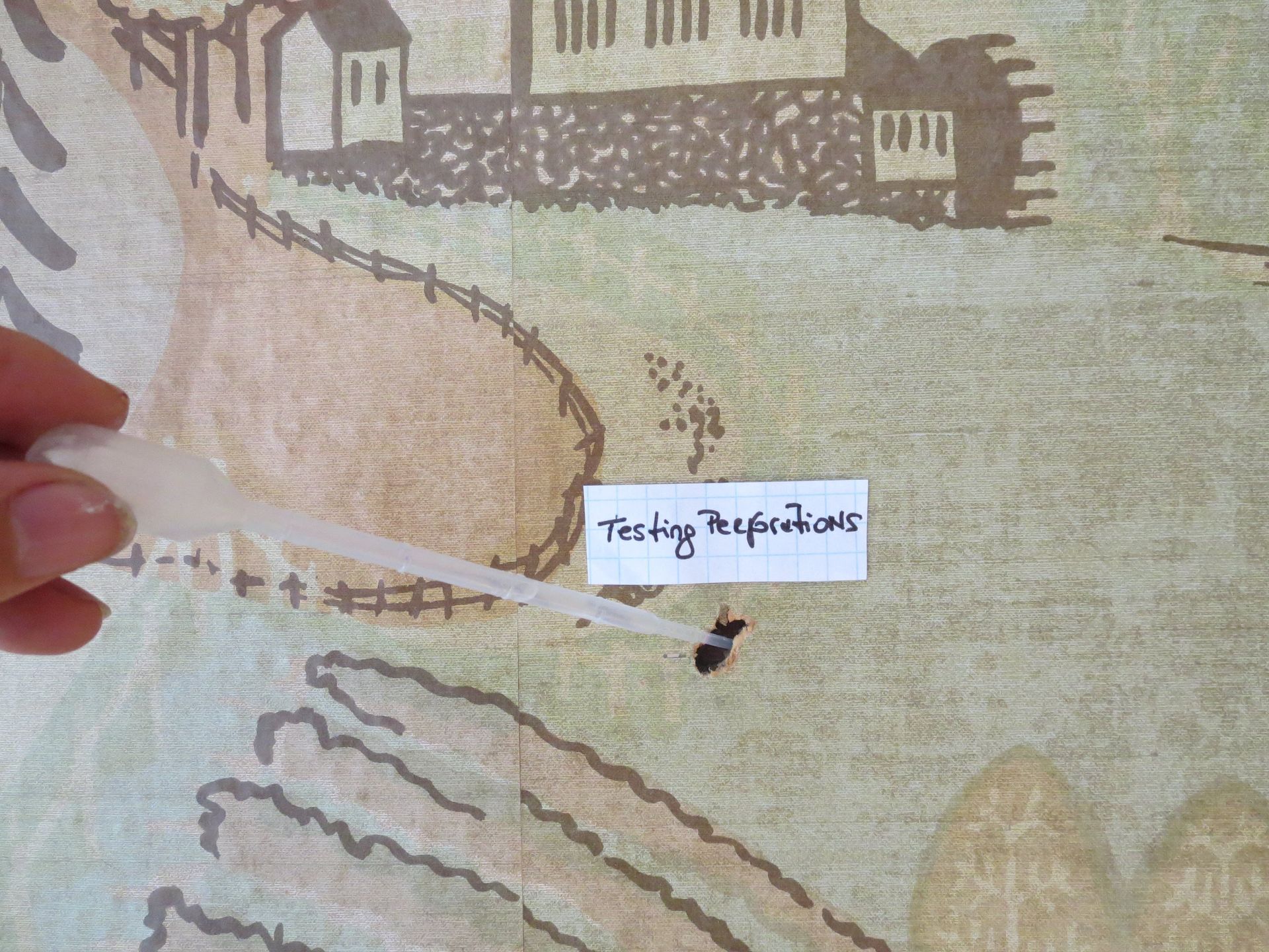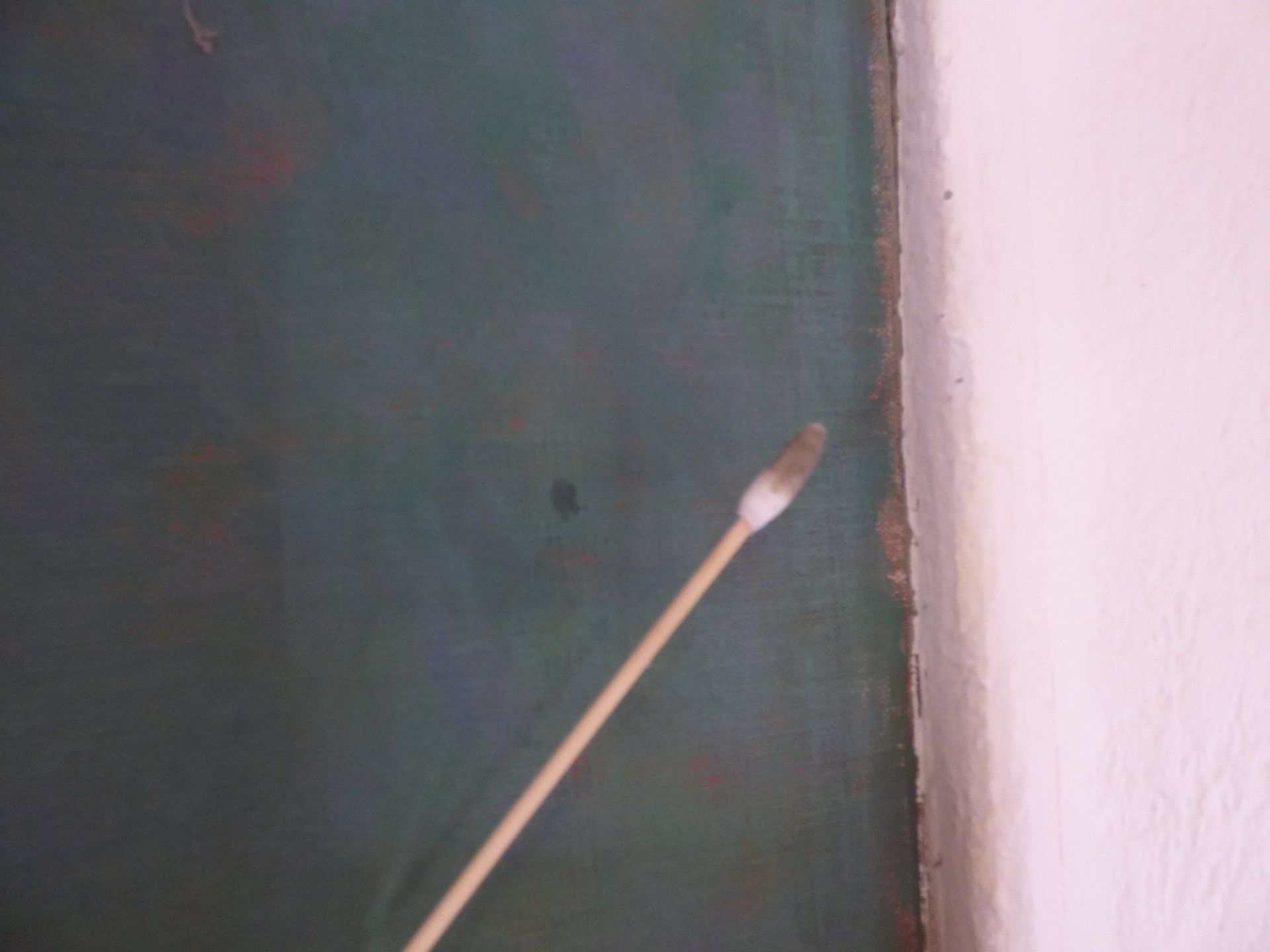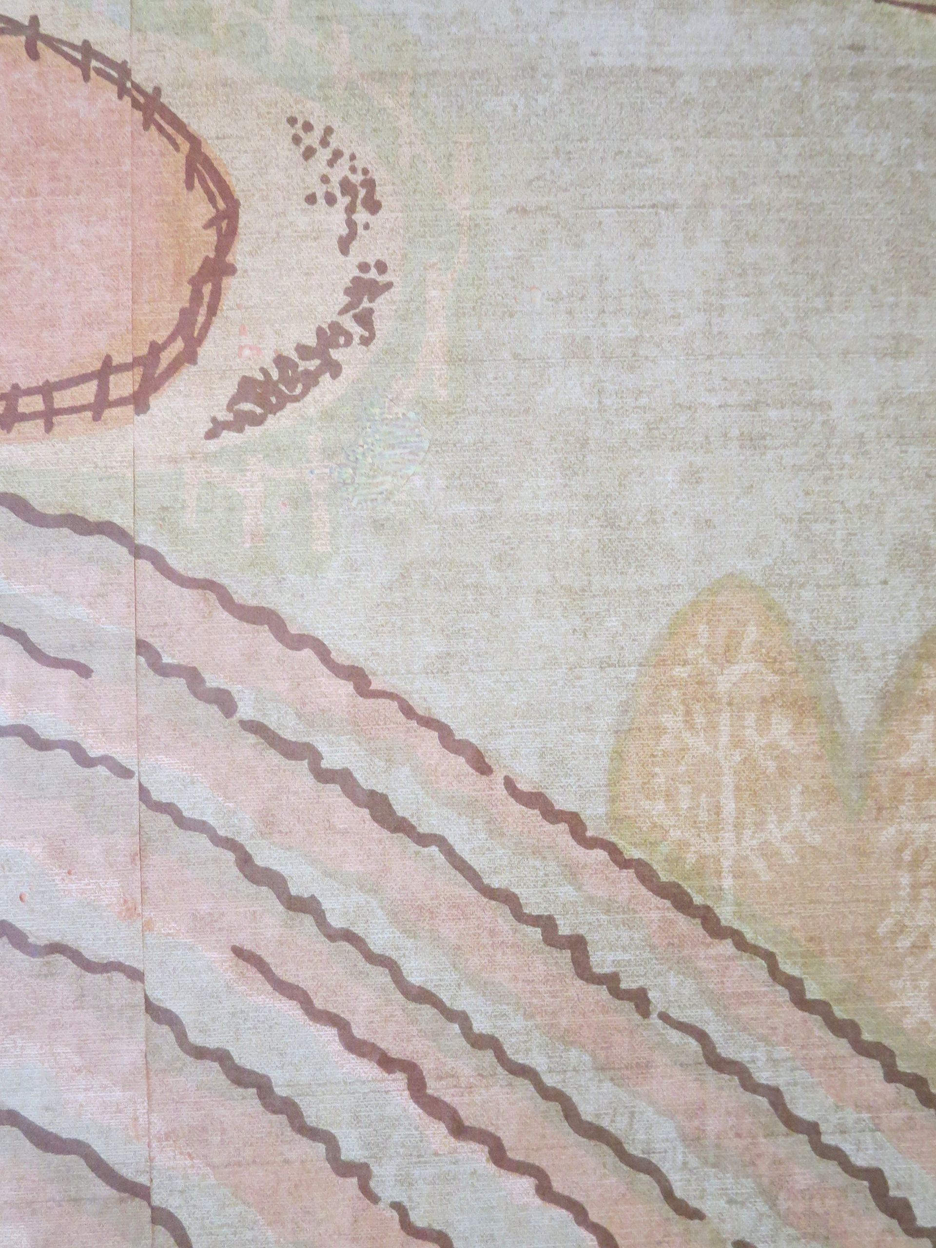 The conservation treatment included repair the structure damage on the substrate. The plaster was detaching from the walls and it was consolidated from the front as well as from the other side of the wall. The wallpaper was surface cleaned, small detachment adhered back and fills and retouch was done on areas with losses.