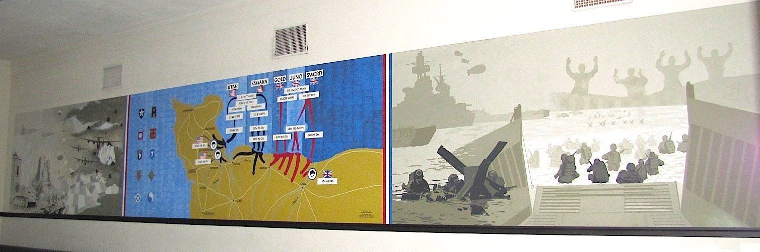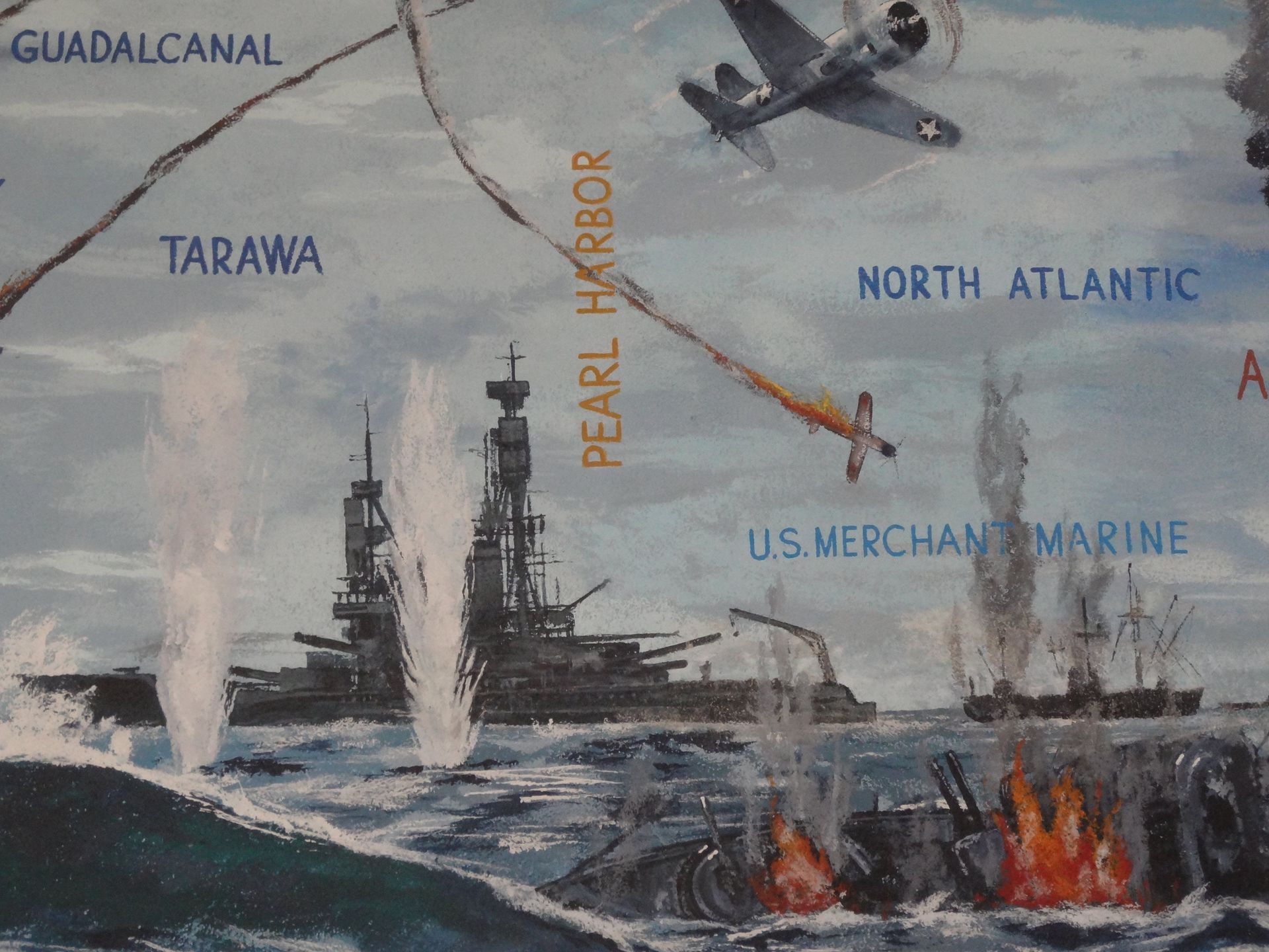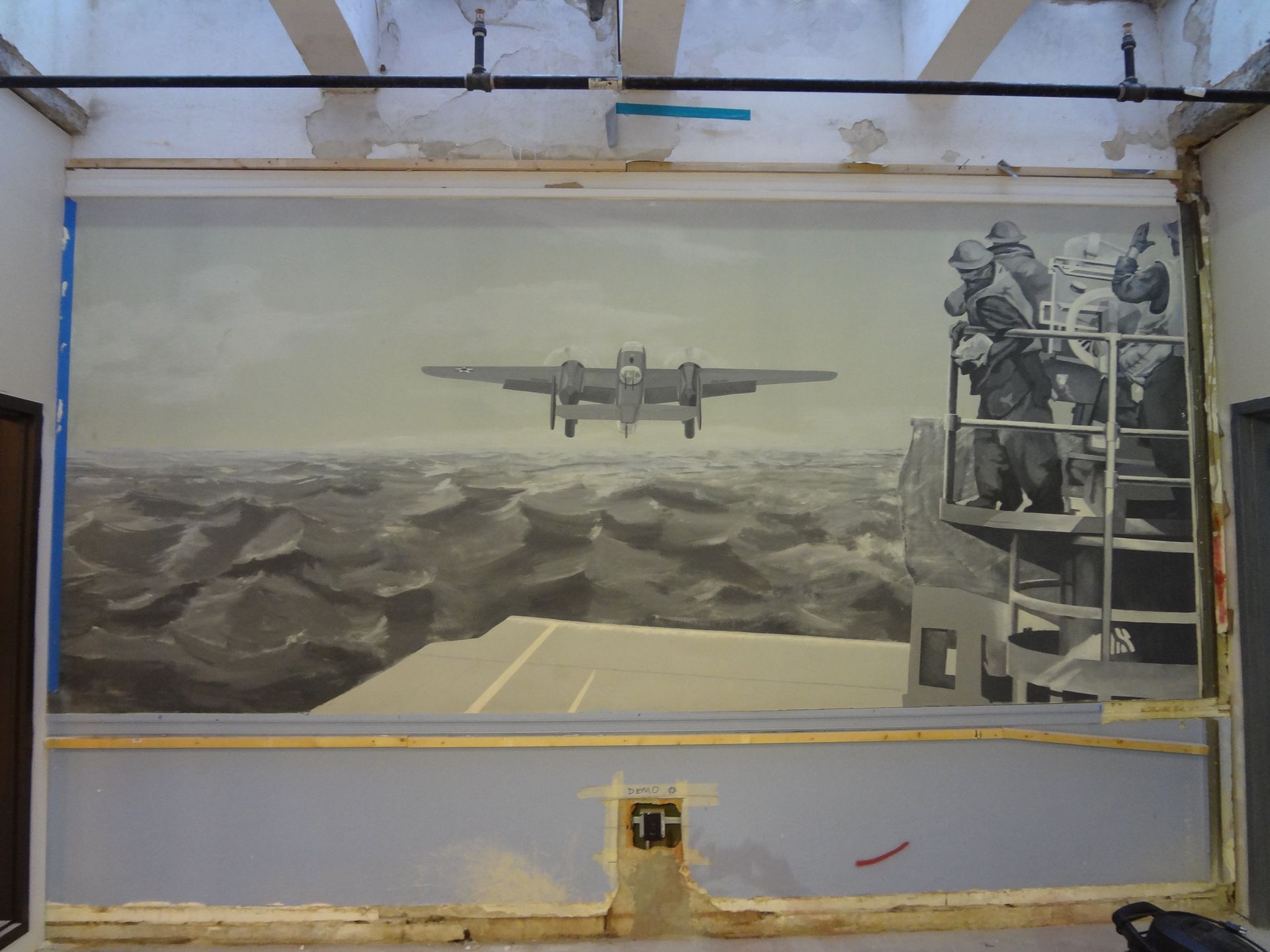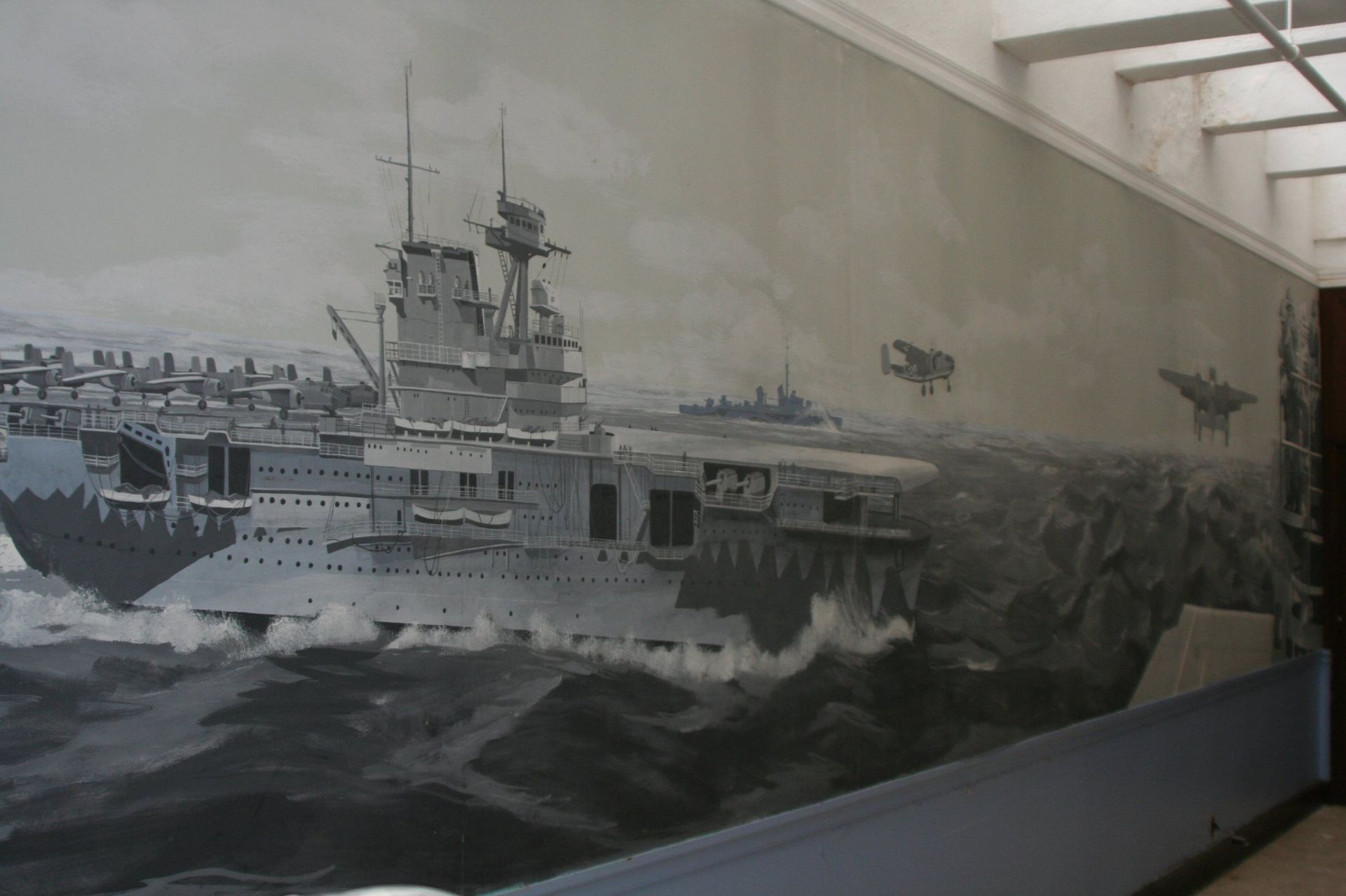 Three mural paintings conserved are dedications to the history of American wars in at land and sea. On the basement the two large mural painting designed by Frank Ackerman depicts naval war boats at sea from War World l. On the 6th floor by the same artist a monumental triptych represents a map of “D” Day and battle locations in the North of France. Another very large mural painting on the 4th depicts battle ships during wars on the Pacific.