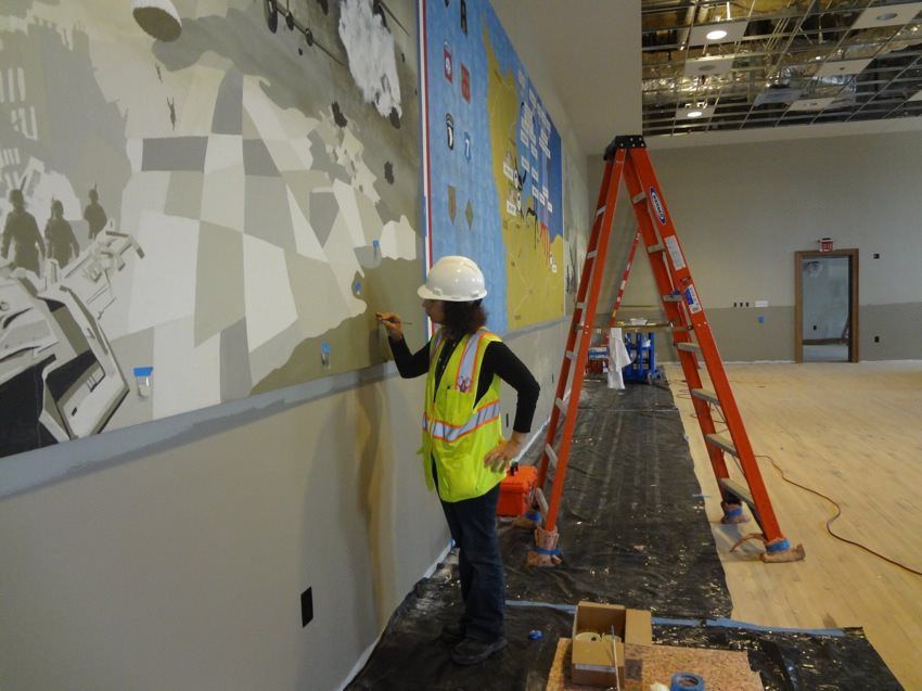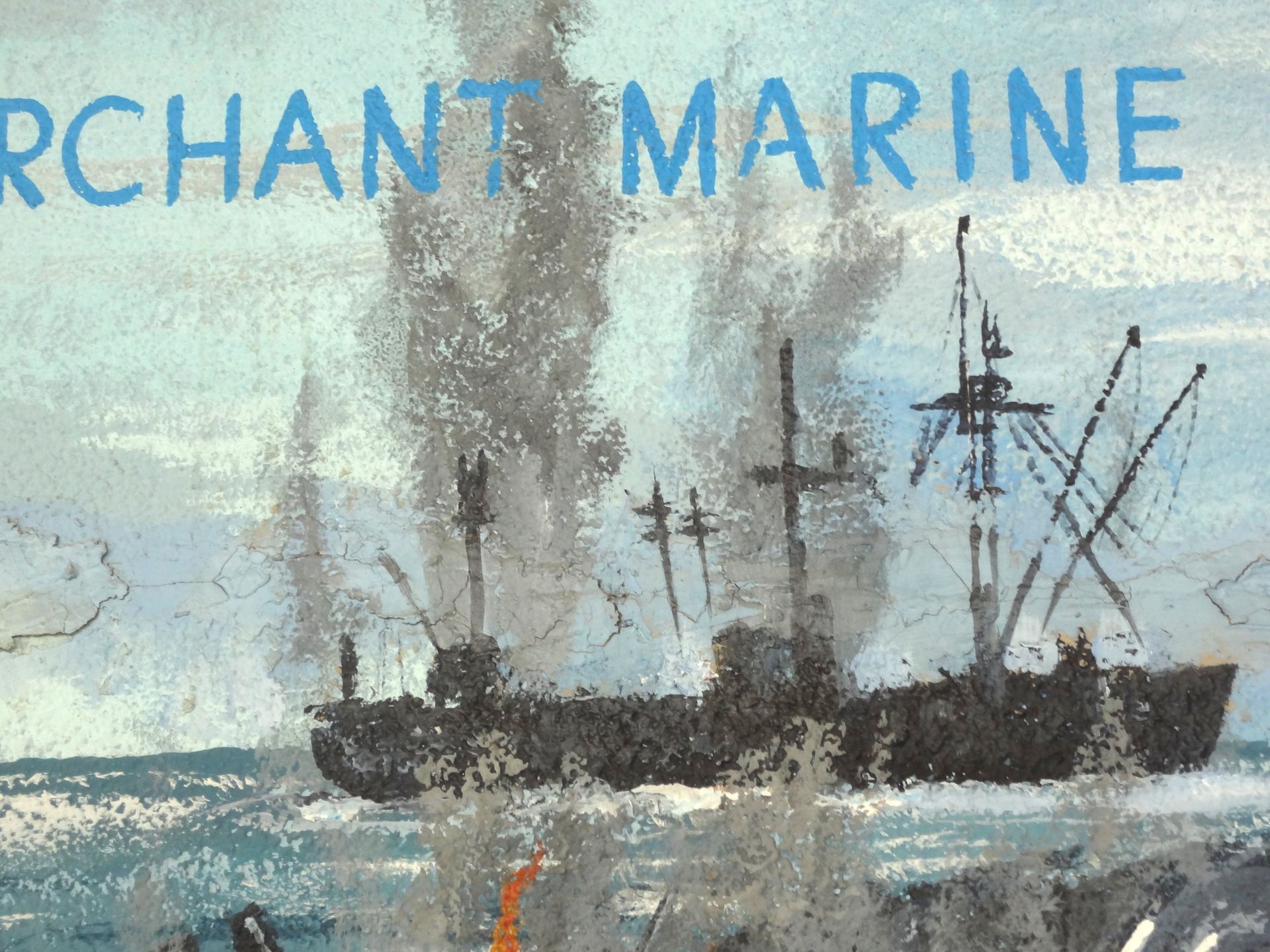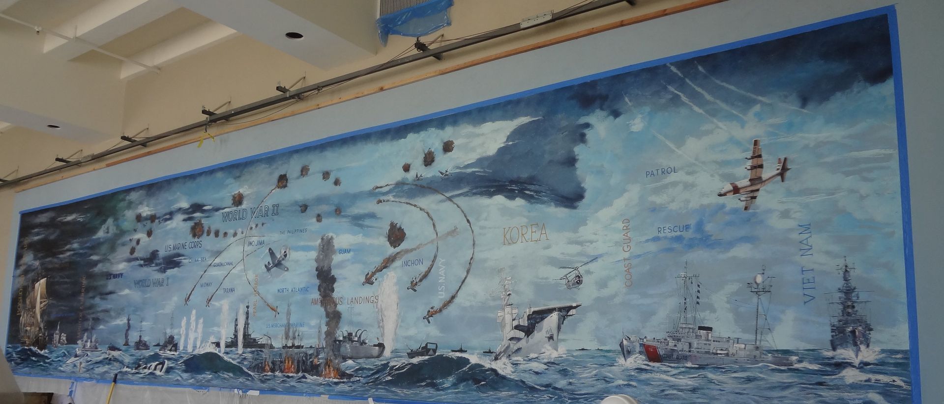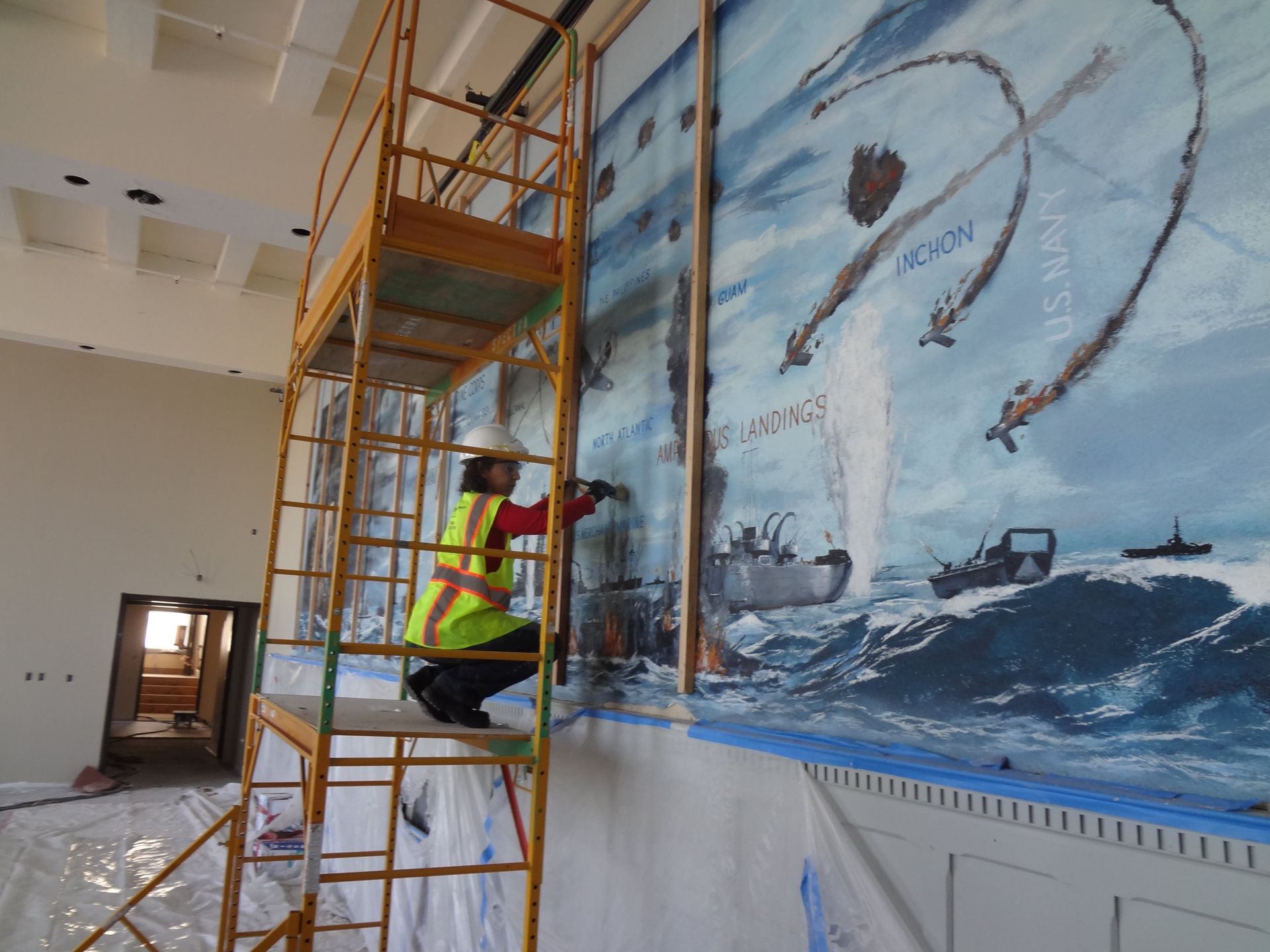 Three mural paintings conserved are dedications to the history of American wars in at land and sea. On the basement the two large mural painting designed by Frank Ackerman depicts naval war boats at sea from War World l. On the 6th floor by the same artist a monumental triptych represents a map of “D” Day and battle locations in the North of France. Another very large mural painting on the 4th depicts battle ships during wars on the Pacific.