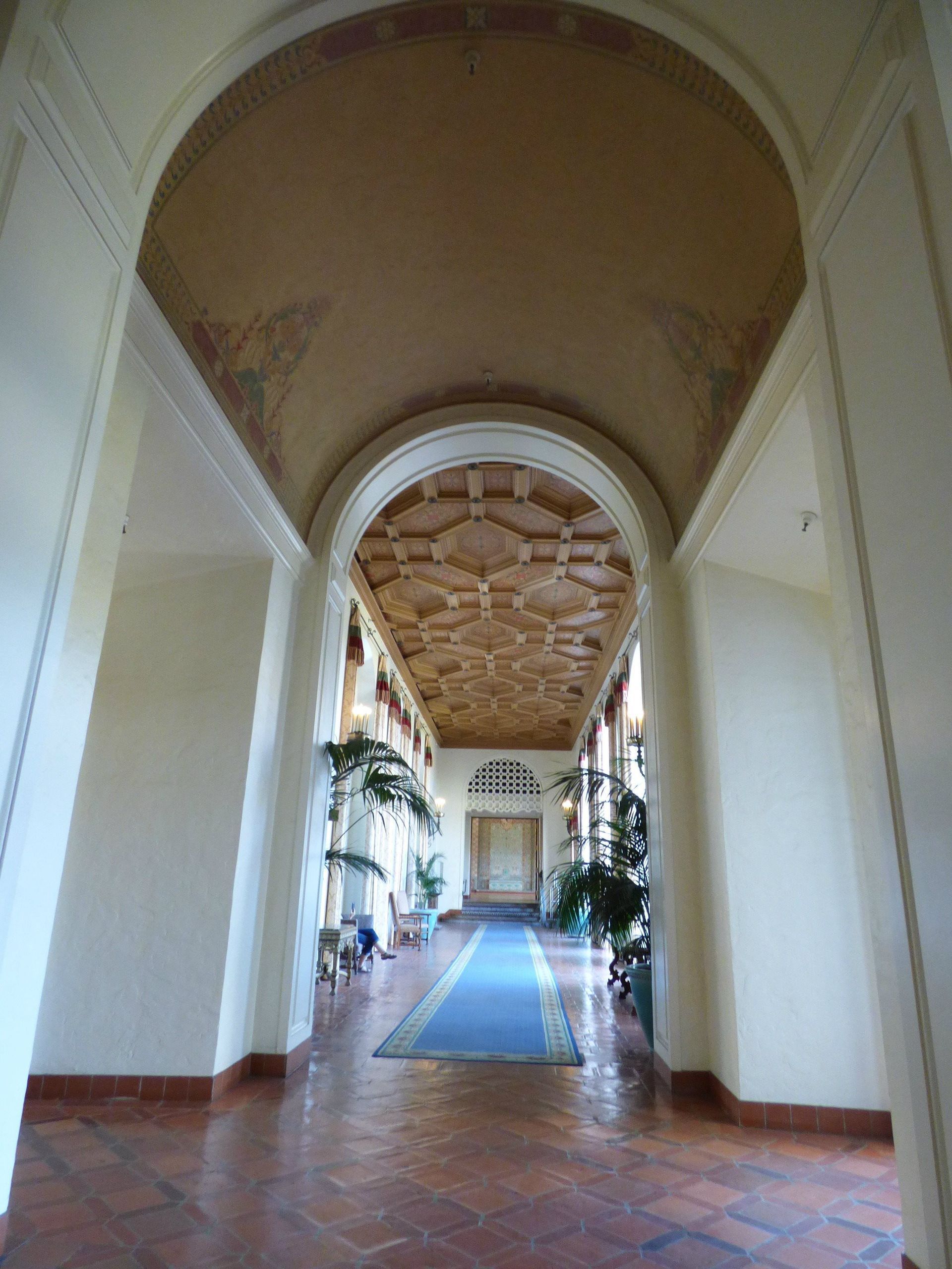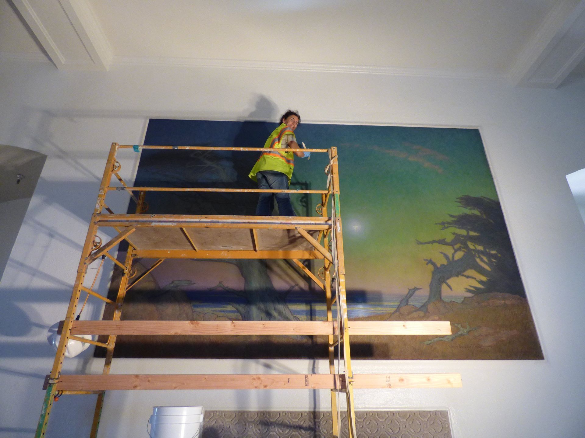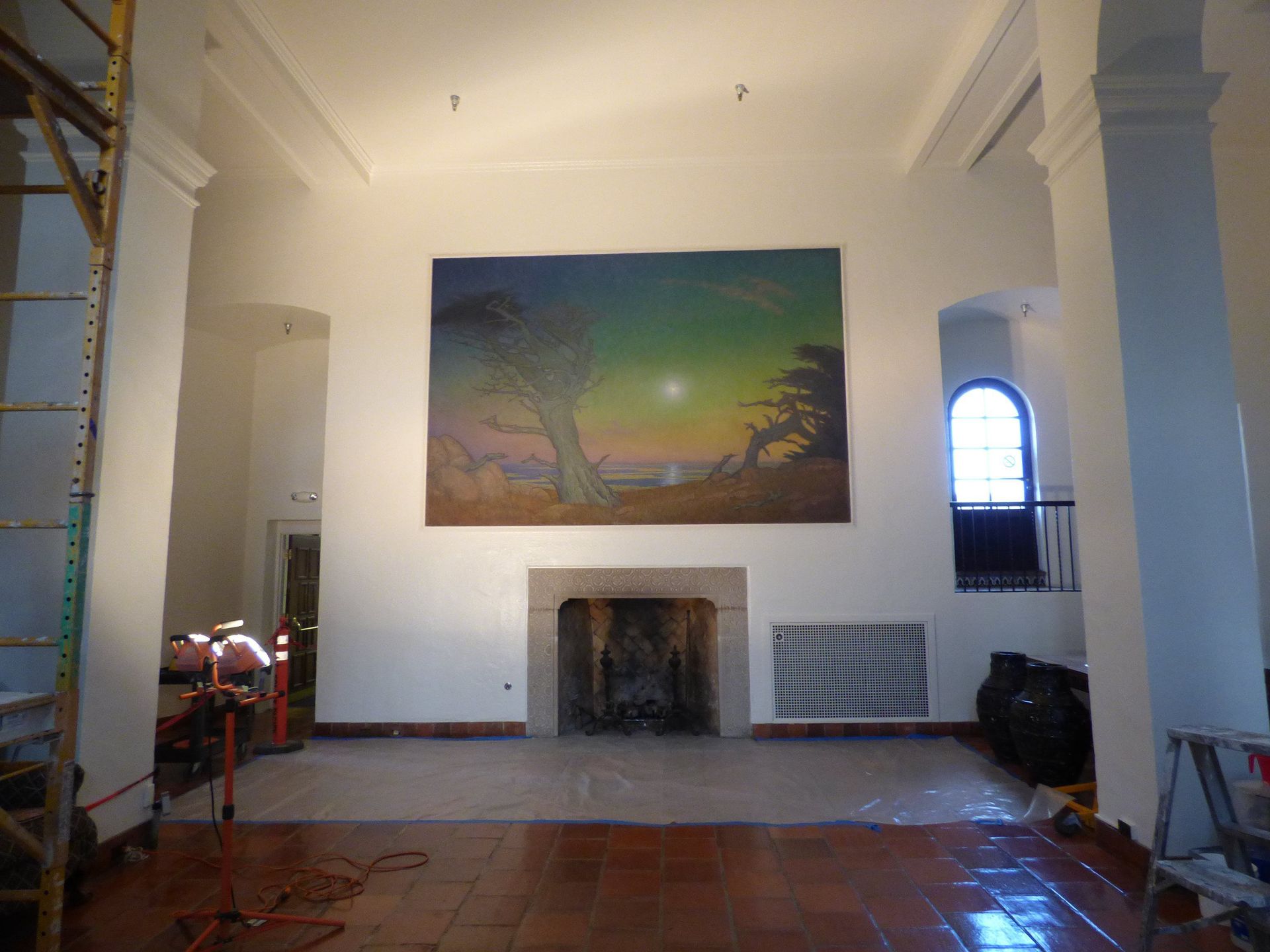 This project consisted of restoring a mural painted by Ferdinand Burgdoff located in the tower of the Hotel del Monte in Monterey, California. The Hotel del Monte first opened its doors in 1880 as the first luxury resort complex in the United States, until it was purchased by the US Navy during WWI, and now functions as an office and hotel for the Naval postgraduate school. The mural artist, Burgdoff (1881-1975), was a Cleveland-born artist, who lived and studied art in his hometown, worked in Paris, and then went on to live the rest of his life in Monterey. He was known for his romantic and stylized landscape paintings of the Southwest desert and the Monterey peninsula.