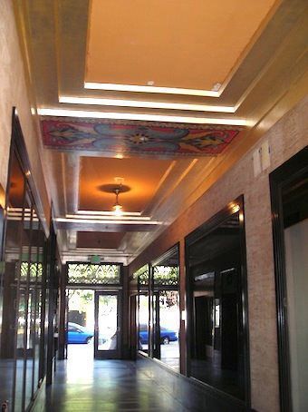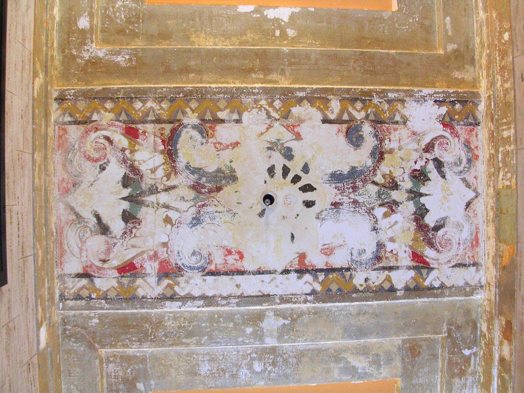 After being neglected for decades the decorative ceiling on the entrance were painted over and over with latex paint in an attempt to cover the damaged paintings.