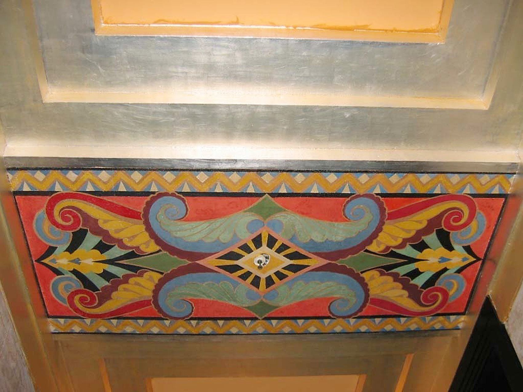 The conservation treatment consisted on removing the layers of over-paint, restituting the drawings and original color as well as the silver-leaf on the stepped ceiling.