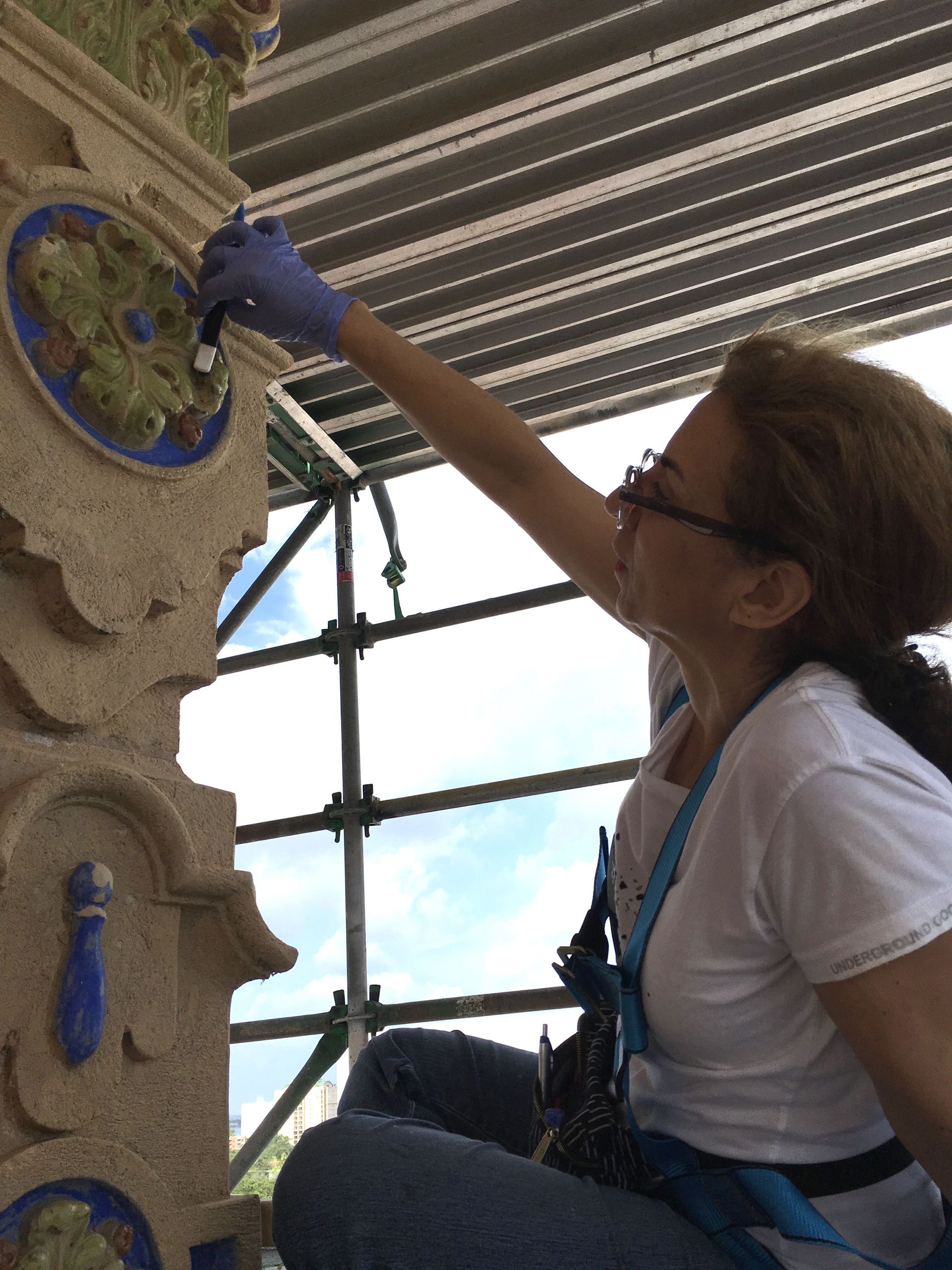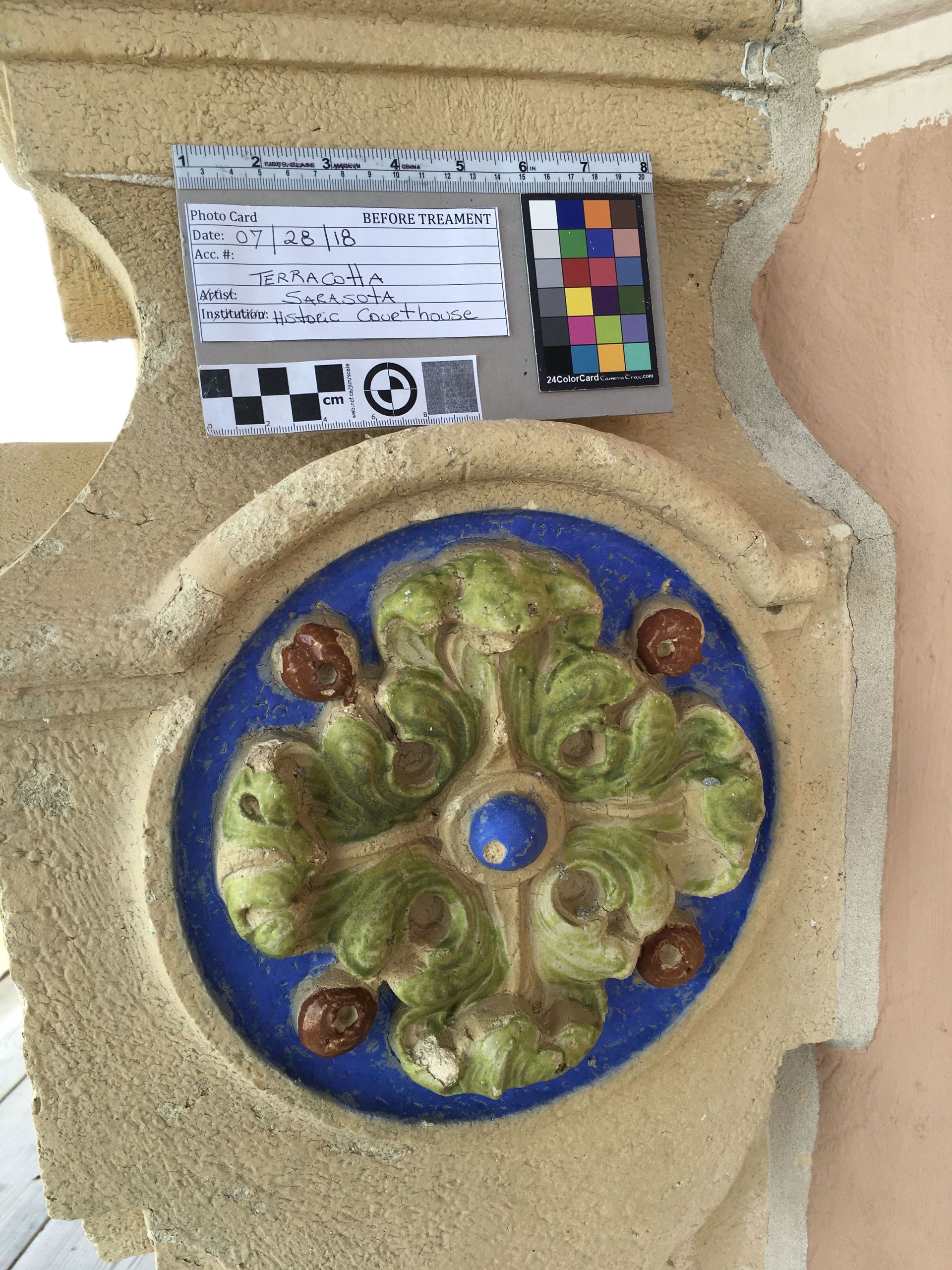 The objective of this conservation project was to stabilize the terracotta (bisque) and the glazing to prevent further damage. Also, to diminish mold growth and to improve the aesthetic appearance of the bright, but faded color glazing.