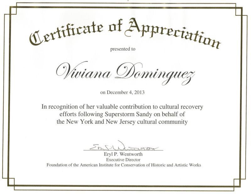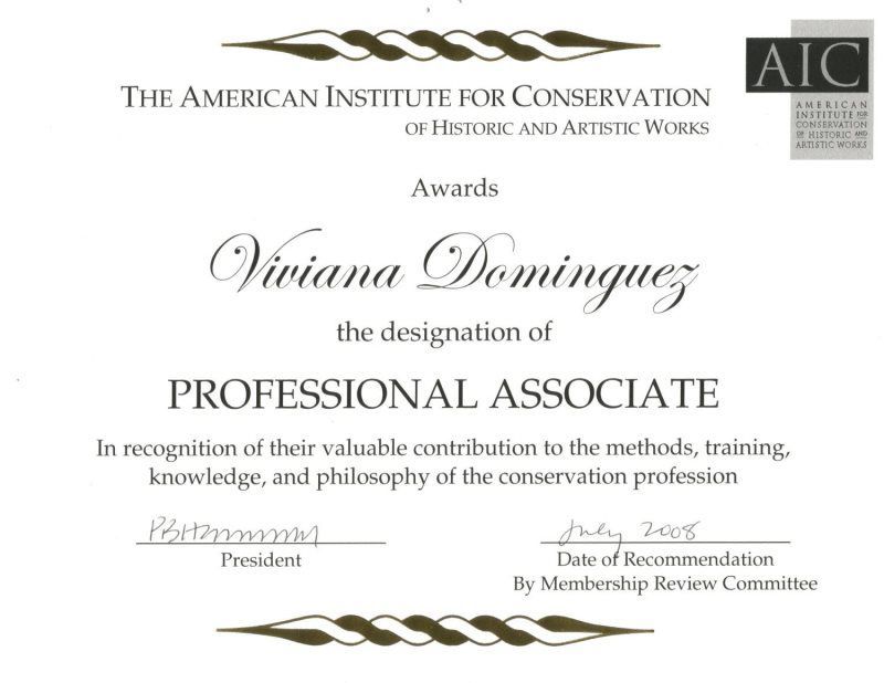 Viviana Dominguez is a true professional as witnessed in her conservation skills and in her work ethic. I had the pleasure of assisting her on a group of paintings that I hired her to conserve; she was a patient and thorough teacher. She was extremely knowledgeable, explaining the terminology as she worked diligently. Although her time management skills were remarkable, she devoted extra hours to complete a painting that sustained major damages. The results were amazing—only a trained eye would be able to see the repairs. She's such a joy to be around that we've become friends.